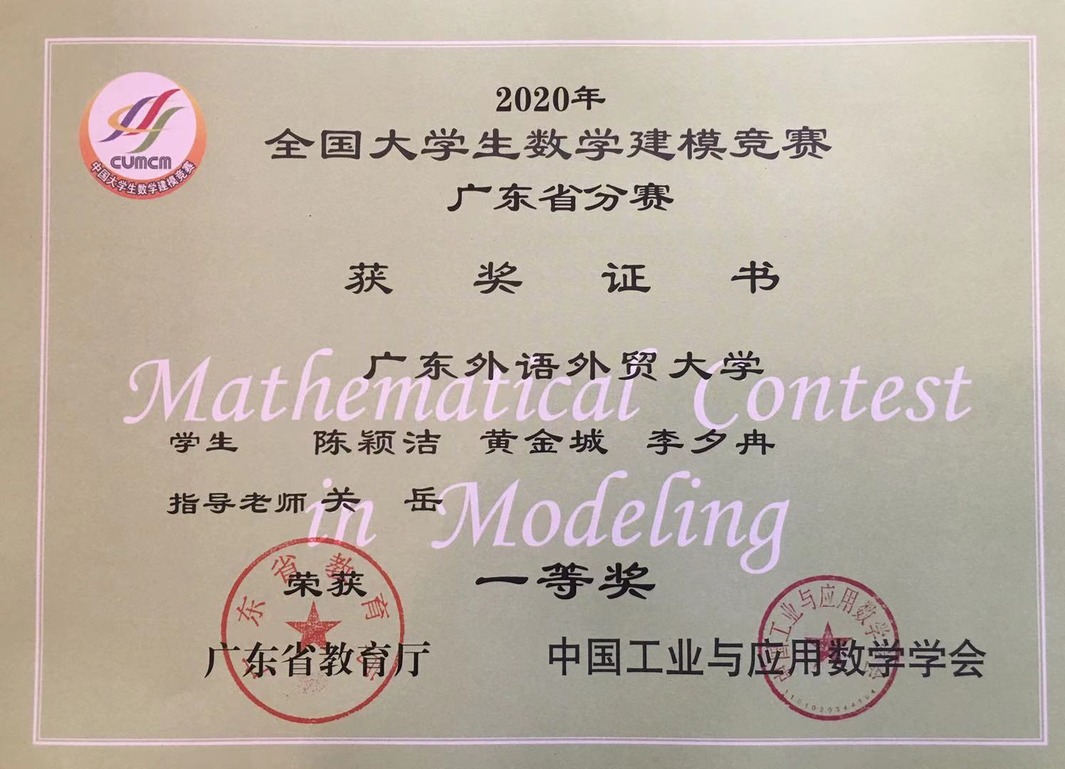 全国大学生数学建模竞赛广东省分赛一等奖证书