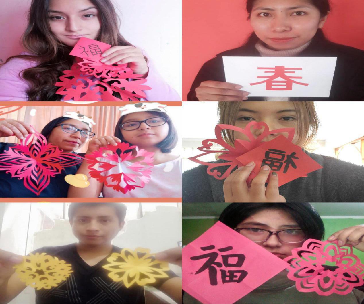 孔院教师们根据学生的汉语水平选择了灵活多样的的活动形式庆祝中国传统春节,在暑期强化班上随堂开展了“喜迎新春”春节系列线上文化课和形式多样的庆祝活动,如初级班的新春歌舞教学、中级班的写“福”剪纸活动、以及高级班的中文写作和美食烹饪文化体验活动,深受学员及其家人的喜爱。学生及家人积极参与、携手合作,共同体验着中国新年带来的吉祥与喜庆。尽管秘鲁当地疫情依然严峻,但学员学习汉语的热情丝毫不减。精彩热烈的春节庆祝活动不仅加深了学员对中国文化的认识和了解,也为秘鲁学生及家人带来了新年的祝福和希望。