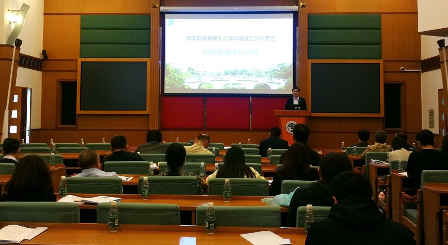本网讯 3月9日下午,新学期发展规划与学科建设工作布置会在北校区国际会议厅召开。校党委常委、副校长何传添主持会议并讲话,各学院分管发展规划与学科建设工作负责人、学科秘书和发展规划处全体人员参加会议。