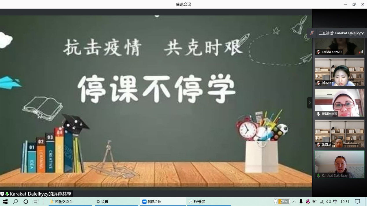 研讨过程中,来自中国、哈萨克斯坦和埃及的骨干教师们分享教学心得。广外艾大孔子课堂的教师毛洁从语言教学、汉字教学和词汇教学三个方面分析了零基础对外汉语线上教学的难点。阿里法拉比哈萨克国立大学东方学系汉学教研室的教师柯拉热从历史发展、办学规模、师资力量、合作交流、课程设置、人才培养等多个角度出发,全面地介绍了学校的汉语教学情况。哈萨克斯坦国际哈中语言学院教师Alima分别从对外汉语课堂教学技巧和网络授课利弊分析两方面介绍了近期的授课情况。教师李婉和教师于珊珊提出授课过程中的交际互动十分重要,课堂要话题要做到与时俱进、紧密联系实际带给学生更好的课堂体验。艾因夏姆斯大学中文系教师Lamiaa表示教师需要保持线上、线下教学的同步互动,做到二者互相补充,努力实现更理想的教学效果。
