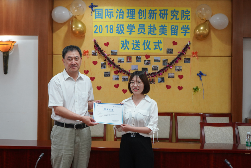 隋广军对即将出国深造的同学们表示祝贺,对国际治理创新研究院的工作成效予以肯定。他强调,国际治理创新研究院自创立以来不断发展,精益求精,培养了一批又一批具有家国情怀、国际视野的复合型国际治理人才。隋广军指出,当今世界正经历百年未有之大变局,中国的国际影响力不断提升,他希望同学们要讲好中国故事,在国际舞台上传播好中国声音,肩负起实现中华民族伟大复兴的重任。他嘱托同学们在国外要做好疫情防护工作,保护人身安全,要热爱祖国,忠于祖国,谨言慎行,常与老师和家人保持联系。隋广军为即将赴美学习的同学们颁发结业证书。