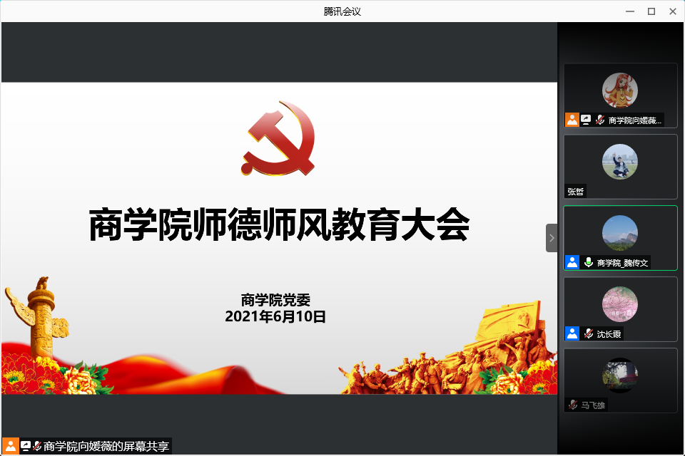 商学院党委书记魏传文向全院教职工传达学校加强师德师风教育的相关要求。他强调,作为一名高校教师,应当遵守新时代高校教师职业行为十项准则,坚定政治方向,自觉爱国守法,传播优秀文化,潜心教书育人,关心爱护学生,坚持言行雅正,遵守学术规范,秉持公平诚信,坚守廉洁自律,积极奉献社会。魏传文讲述了张桂梅同志的先进事迹,号召广大教师向张桂梅同志学习,大力弘扬矢志不渝跟党走、痴心执着办教育、无私无我育新人的精神,学习张桂梅坚守初心、对党忠诚的崇高品格;爱党敬业、爱生如子的高尚师德;执着奋斗、无私奉献的至诚情怀。同时要求全体教师牢固树立底线意识,端正教育思想,加强道德修养,真正做到立德树人,坚决执行师德师风铁律,成为深受学生爱戴的人民教师。会议由学院党委副书记沈长霞主持。