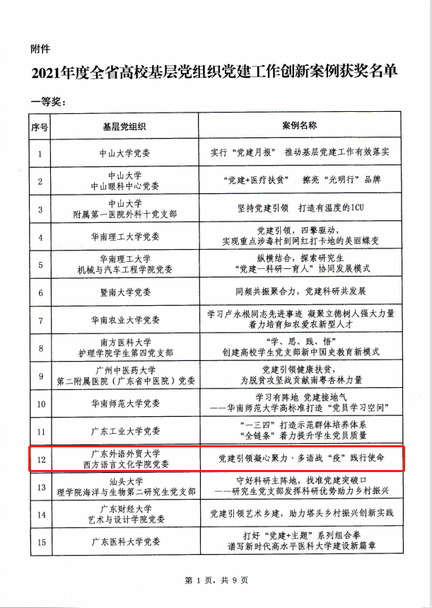 本网讯 近日,广东省委教育工委公布2021年度全省高校基层党建工作创新案例评选结果,我校取得丰硕成果,西语学院党委工作案例获一等奖,经贸学院党委工作案例获二等奖,翻译学院工作案例获三等奖,东语学院党委工作案例获优秀奖。