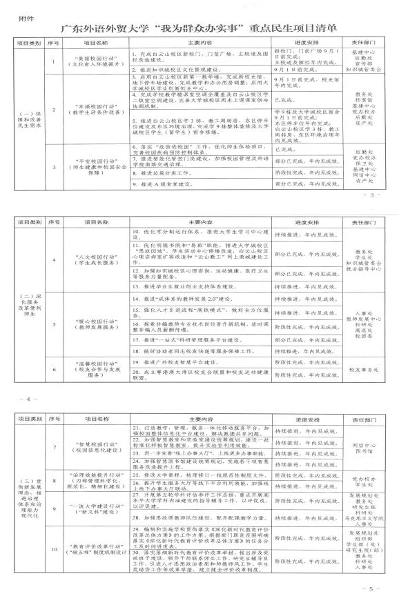 在“我为群众办实事”重点民生项目中,“三大类别”包括保障和改善民生需求、深化服务改革便利师生和贯彻新发展理念,推进治理体系和治理能力现代化。“十大行动”包括:以“美丽校园行动”提升文化育人环境、以“幸福校园行动”改善教学生活条件、以“平安校园行动”保障师生健康和校园安全、以“人文校园行动”服务学生成长、以“暖心校园行动”服务教师发展、以“温馨校园行动”服务校友合作与发展、以“智慧校园行动”推进校园信息化建设、以“治理效能提升行动”加强内部管理,以“一流大学建设行动”加强“新文科”建设、以“教育评价改革行动”推动“破五唯”制度机制设计,既突出解决师生“急难愁盼”的“小民生”,又兼顾学校事业发展的“大民生”。