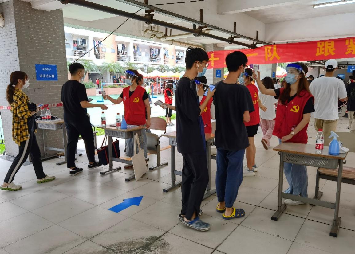 检测现场分为登记区、等候区、检测区,各区域均设有志愿者进行指引,整个环节井然有序。同心抗疫,党员先行,在每一个岗位上都有党员志愿者的身影,他们身着红色马甲,在流程指引、温度测量、协助医护人员等方面助力核酸检测工作。党员志愿者在本次核酸检测中打头阵、做表率,把党的优良作风落到实处,切实为广大师生员工服务。