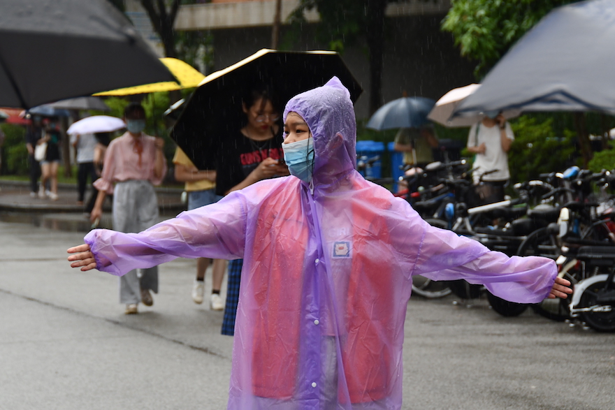志愿者雨中维持秩序