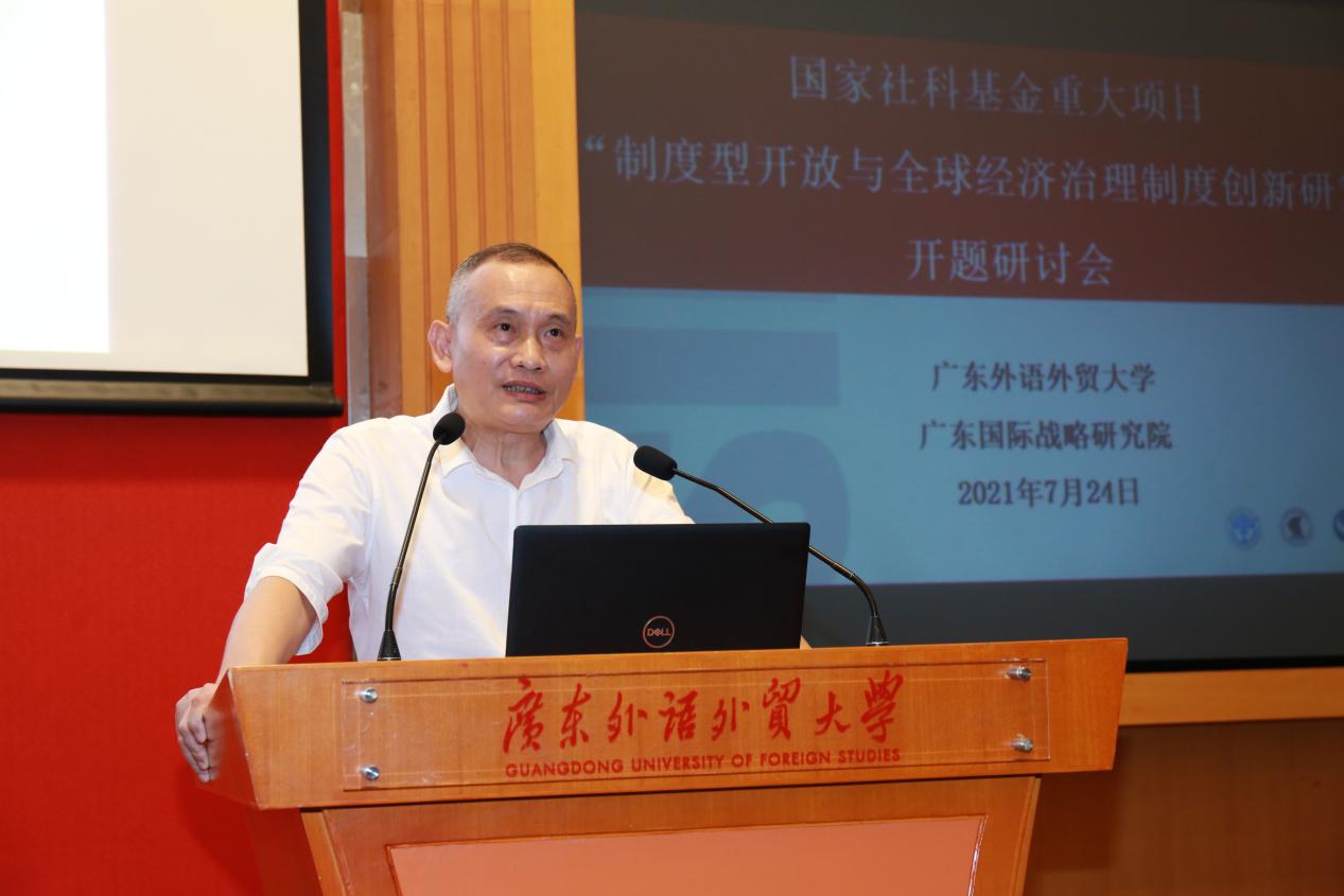 项目首席专家、广东国际战略研究院高级研究员、我校教授陈伟光从课题的研究背景、核心问题、研究内容、研究计划、研究方法等五方面对项目进行了总体汇报。在梳理2015年以来全球经济治理领域发生的重大历史事件基础上,他指出本课题聚焦于研究制度,重点从理论层面上构建制度型开放和全球经济治理制度创新的理论框架,剖析两者的互动关系,指出实践中的重点领域和实现路径,以期在理论与实践层面共同诠释中国如何通过制度型开放推动全球经济治理制度的创新。本次开题论证会由中国社会科学院亚太与全球战略研究院院长李向阳担任开题论证专家组组长。