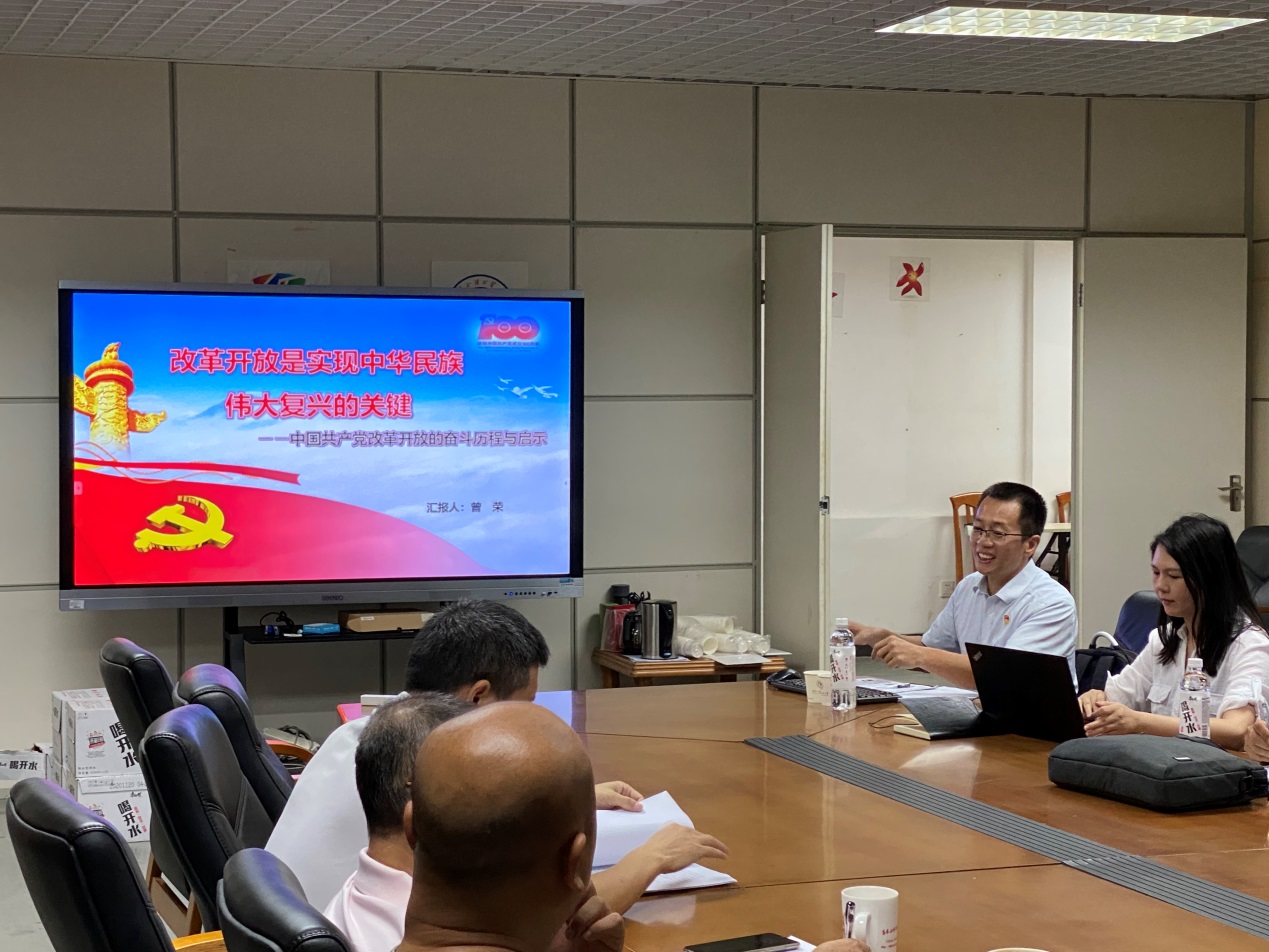 本网讯 近日,为扎实推进党史学习教育,体育部党总支在南校区体育馆新闻发布厅,邀请学校百年党史宣讲团成员、马克思主义学院教授曾荣为全体党员作中国改革开放的奋斗历程与启示专题宣讲。