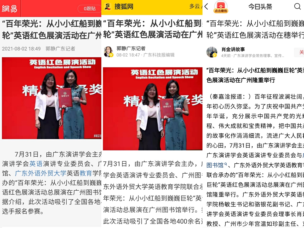 本网讯 为庆祝中国共产党成立100周年,深入开展党史学习教育,近日,由广东演讲学会主办,我校英语教育学院与广东演讲学会英语演讲专业委员会、广州图书馆联合承办的英语红色展演活动总展演在广州图书馆举行。活动以“百年荣光:从小小红船到巍巍巨轮”为主题,要求选手以史实为依据,用英文生动讲述中国共产党故事,用小故事呈现大历史,让世界更好地了解中国共产党,了解中国。