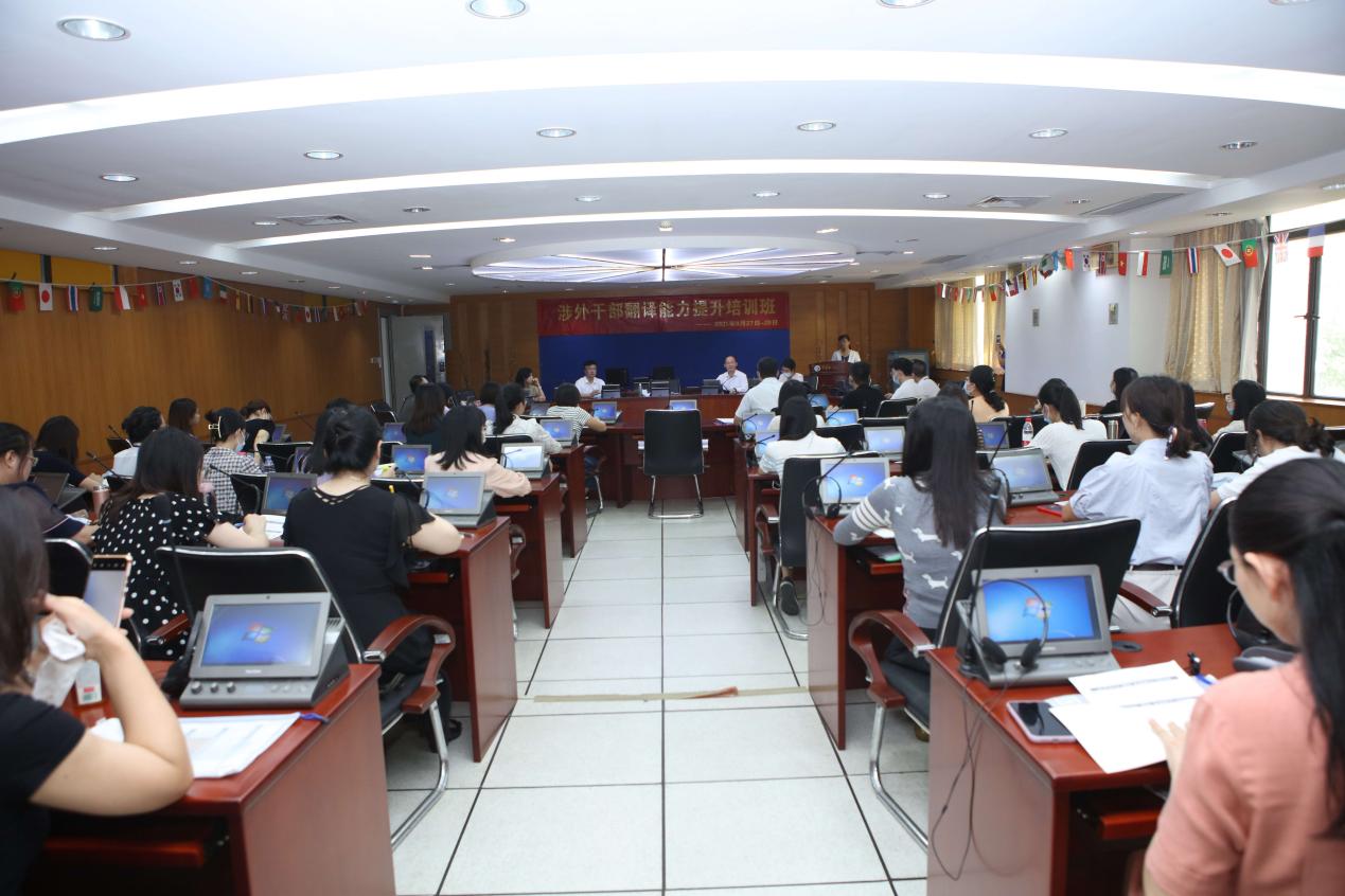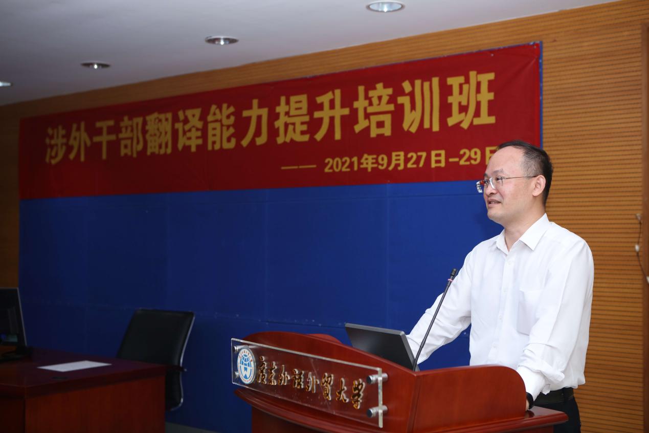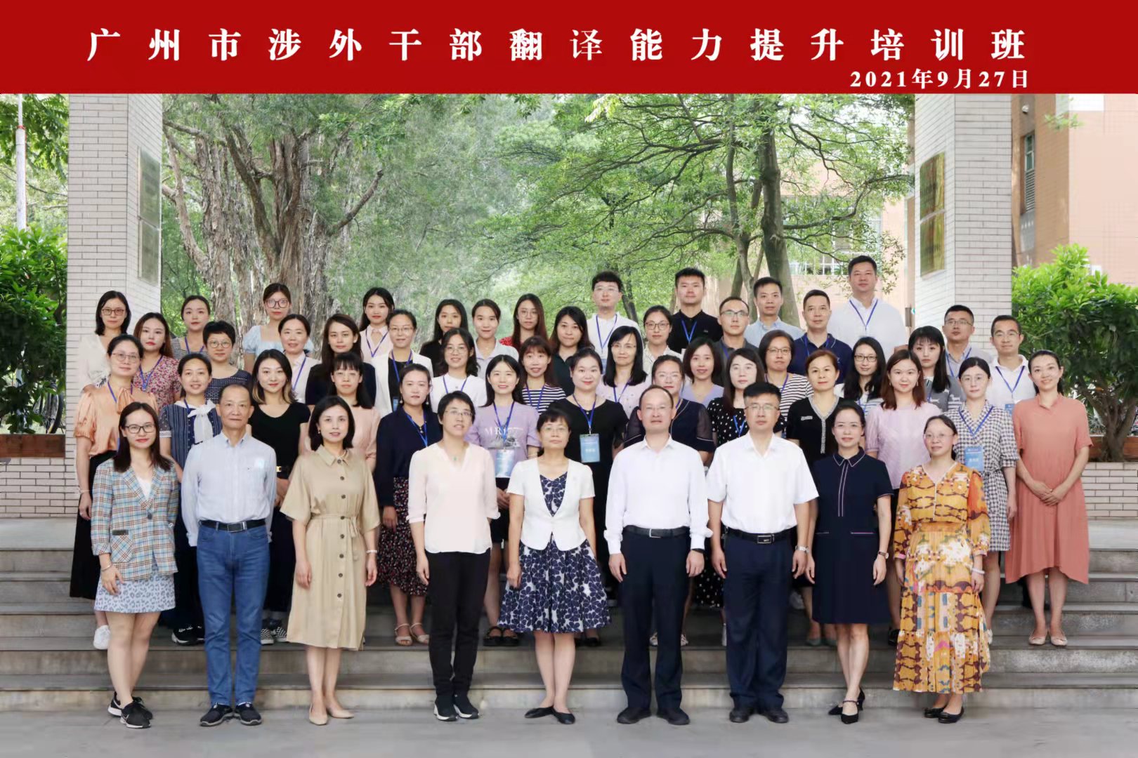 本网讯 9月27日,由中共广州市委外事工作委员会办公室主办,我校翻译学院与广州市外事翻译室共同承办,我校国家级同声传译实验教学中心协办的2021年广州市涉外干部翻译能力提升培训班在北校区开班,来自广州市直单位及区政府单位、河北石家庄市的涉外干部50余人参加学习。我校党委常委、副校长王廷惠,广州市委外办副主任雷玮琚在开班仪式上分别致辞。