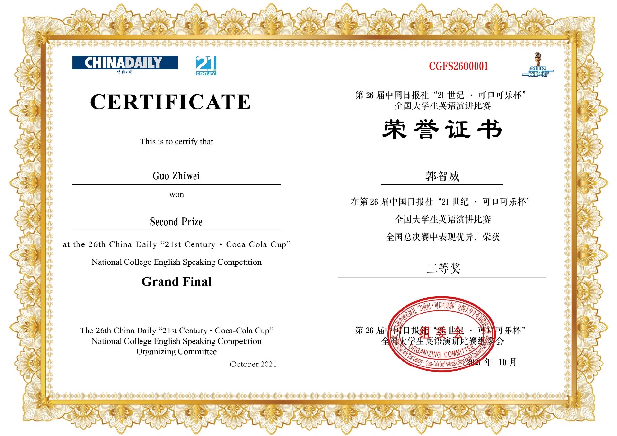 本网讯 10月4日至6日,第25届中国日报社“21世纪杯”全国大学生英语演讲比赛总决赛在四川成都的“中国—欧洲中心”举行。翻译学院教授陈朗带队参赛,我校2019级翻译专业学生郭智威取得全国二等奖的好成绩。