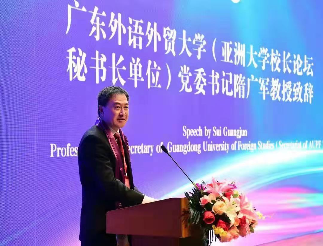 我校党委书记隋广军在开幕式上致辞。他代表亚洲大学校长论坛秘书处及学校,表达了对浙江越秀外国语学院建校40周年校庆的美好祝福,对该校在推进高等教育国际化、高质量发展、对接经济社会需求培养高素质人才等方面的成绩表示赞赏。回顾亚洲大学校长论坛过往二十载峥嵘岁月,他表示,论坛坚持以“教育为本”为初心,以“自愿、平等、友好、学习”为原则,在推动高校间的交流合作、促进人才联合培养和高等教育改革等方面作出卓越贡献。面对后疫情时代带来的挑战与机遇,他强调,本次论坛的主题“后疫情时代亚洲高等教育共同体建设”在新形势下具有深远意义。广外作为一所国际化特色鲜明的高校,作为亚洲大学校长论坛秘书处,将与各校通力合作,共同促进亚洲地区高校更加广泛和高水平合作,共同推进亚洲乃至世界高等教育事业更好回应世界百年未有之大变局。