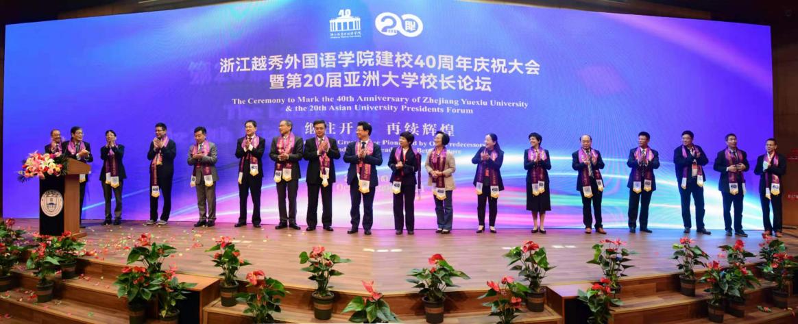 本网讯 10月30日,浙江越秀外国语学院建校40周年庆祝大会暨第20届亚洲大学校长论坛(Asian University Presidents Forum, AUPF)开幕式于浙江越秀外国语学院以线上线下方式举行。来自18个国家和地区的72所高校代表参与了本次论坛,庆祝越秀建校40周年,共商亚洲高等教育发展大计。