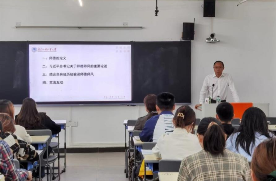 郭桂杭围绕“不忘初心,矢志不渝奋斗青春”主题展开师德宣讲。他远溯儒家文化中“言传身教”的师德传统,近论教育部颁布的《新时代高校教师职业行为十项准则》,从理念到实践,全面阐明了师德的内涵。郭桂杭阐释了习近平总书记关于师德的重要论述,强调师德师风是评价教师队伍素质的第一标准,要用心投入教育事业,做学生全面发展的“引路人”,并结合自身近30年执教生涯,畅谈教师成长的种种机遇与挑战。
