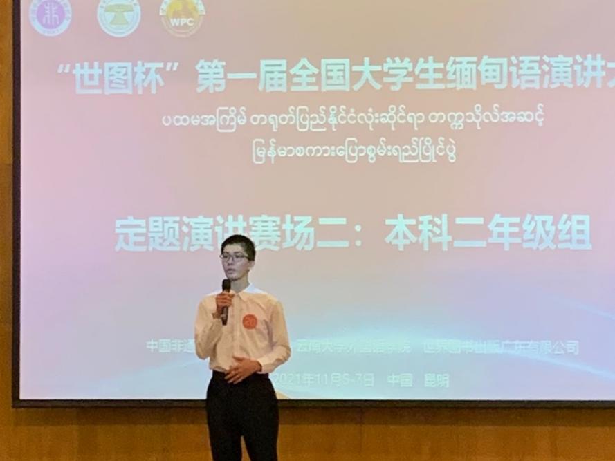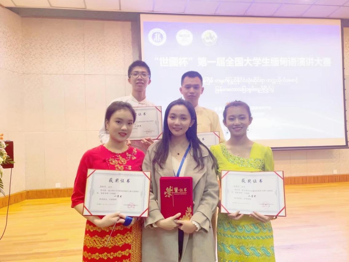 经过选拔,我校缅甸语专业共派出四名选手参加了本次比赛。由东方语言文化学院缅甸语系系主任吴迪带队,2019级学生林煜鹏、唐榕苓参加本科三年级组比赛,2020级学生陈学耀、雷斯佳参加本科二年级组比赛。11月6日上午进行定题演讲,下午举行了即兴演讲,内容涵盖缅甸历史、文化、国情以及中缅关系等。经过激烈角逐,我校参赛学生以优异的表现斩获全员获奖的好成绩。其中,缅甸语1901班唐榕苓获本科三年级组一等奖,缅甸语2001班雷斯佳以及陈学耀获本科二年级组二等奖,缅甸语1901班林煜鹏获本科三年级组三等奖。张卫国荣获“最佳指导奖”,吴迪、赵彩军荣获“指导优胜奖”。