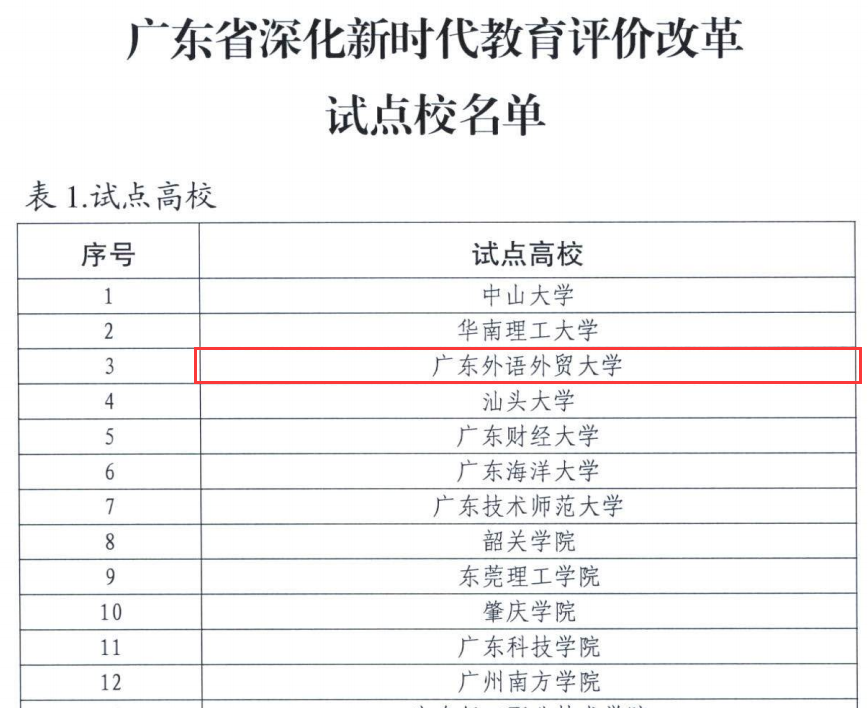 本网讯 近日,中共广东省委教育工作领导小组办公室发布《关于公布广东省深化新时代教育评价改革试点名单的通知》,我校入选全省深化新时代教育评价改革试点高校,是此次获批为试点校的12所本科院校之一;“深化职称制度改革,完善教师评价标准”等5个项目获批为单项试点项目,单项试点项目总数位居全省本科院校第一。