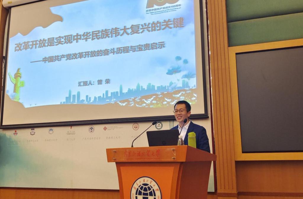 曾荣作题为“改革开放是实现中华民族伟大复兴的关键——中国共产党改革开放的奋斗历程与宝贵启示”的主题讲座。曾荣从开创实行改革开放、推进发展改革开放、加快推动改革开放、全面深化改革开放四个阶段全面介绍了我国改革开放四十余年的历程和取得的伟大成就。他以40多年伟大实践中的详实案例和数据,阐明改革开放是决定当代中国命运的关键抉择、当代中国发展进步的活力之源、党和人民事业大踏步赶上时代的重要法宝和实现中华民族伟大复兴的必由之路,并总结出改革开放成功的重要启示为坚持党的全面领导、坚持以人民为中心的发展思想和构建全面开放新格局。讲座也充分展示了我校师生在改革开展进程中做出的努力和贡献,其中包括国际交流党总支各支部在新征程中积极响应国家战略,以实际行动积极开展国际合作和交流、积极贡献广外智慧、主动对外讲好中国故事等感人事迹。