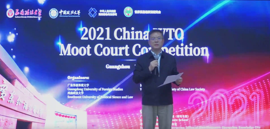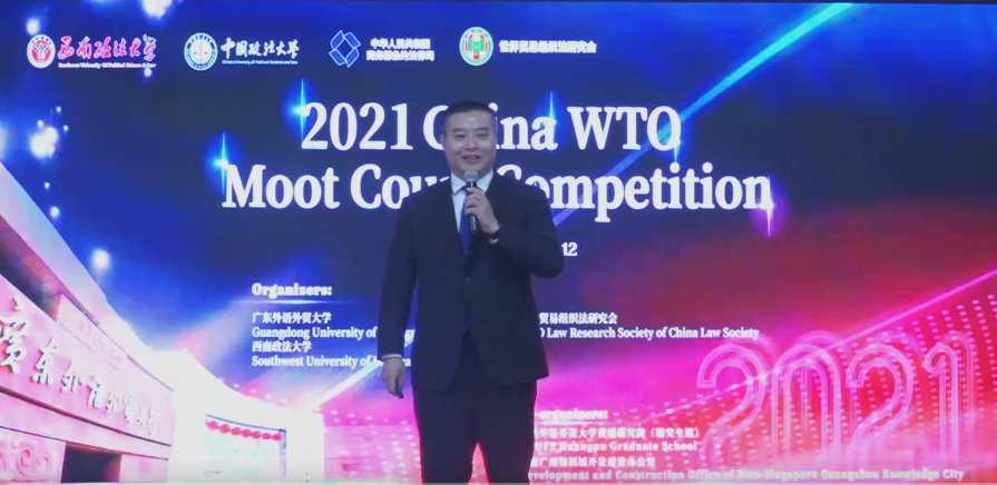 石佑启强调,2021年是中国共产党成立100周年,也是中国加入世界贸易组织20周年,举办第十届中国WTO模拟法庭竞赛意义尤为重大。他指出,广东外语外贸大学是一所国际化特色鲜明的广东省高水平大学重点建设高校,广外法学学科最早可追溯到1996年成立的国际法系,经过多年建设与发展,已形成“法学+外语”和“外语+法学”两种模式,基本建成本-硕-博贯通、高校-社会协同的立体化涉外法治人才培养体系。他表示,当今世界正面临百年未有之大变局,以国际法和WTO规则为基础的多边主义既面临艰巨挑战,也蕴藏着重要机遇。期待各位专家评委和参赛队伍借助竞赛平台,共同探讨WTO规则运用及WTO改革问题,为推动多边贸易体制的发展贡献更多智慧和力量。