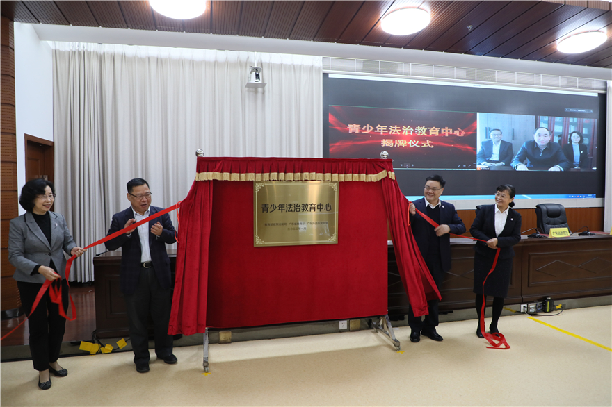 本网讯 1月11日,教育部政策法规司、广东省教育厅与我校三方共建的青少年法治教育中心揭牌成立。教育部政策法规司司长邓传淮、巡视员王家勤,广东省教育厅党组书记、副厅长朱孔军,我校党委副书记、校长石佑启、副校长王廷惠出席成立仪式。省教育厅副厅长那佳主持会议。活动通过线上线下相结合的方式举办,设立教育部和广东省教育厅两个会场。