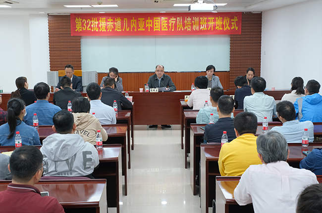 本网讯 1月7日上午,广东省卫生健康对外合作服务中心第32批援赤道几内亚医疗队西班牙语培训班举行开班典礼。广东省卫生健康委一级巡视员陈祝生,广州市卫生健康委党组成员、一级调研员胡文魁,广东省卫生健康对外合作服务中心主任黄晓亮,我校高等继续教育学院相关负责人,第32批援赤道几内亚中国医疗队队员代表等出席会议。