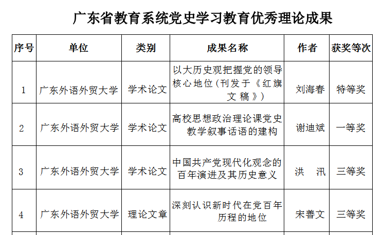 为集中展示全省教育系统党史学习教育理论成果,2021年11月至12月,省委教育工委党史学习教育领导小组办公室开展党史学习教育优秀理论成果征集活动,我校学术论文《以大历史观把握党的领导核心地位(刊发于《光明日报》)》获特等奖,学术论文《高校思想政治理论课党史教学叙事话语的建构》获一等奖,学术论文《中国共产党现代化观念的百年演进及其历史意义》、理论文章《深刻认识新时代在党百年历程的地位》获三等奖。
