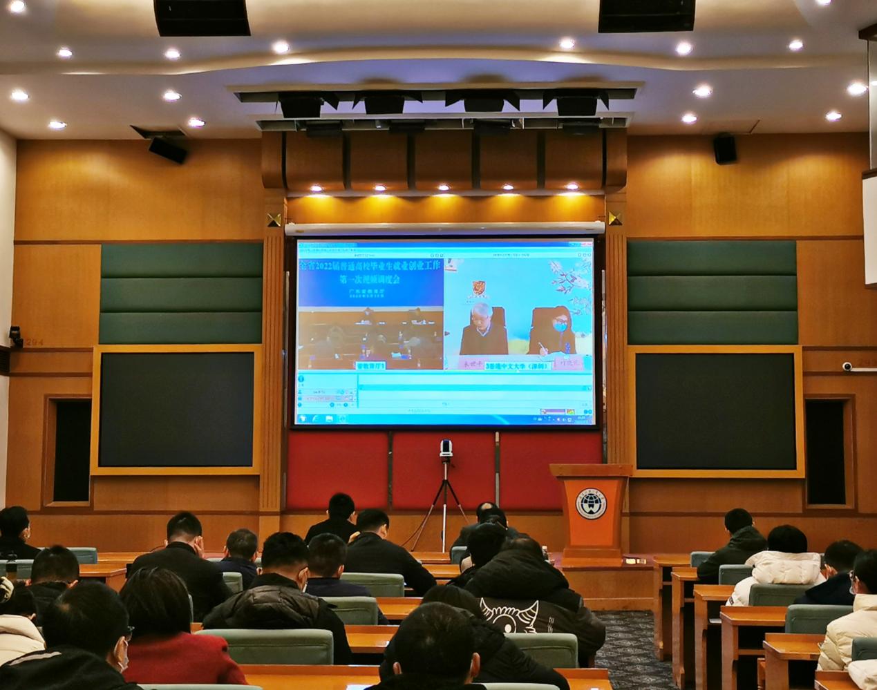 本网讯 2月22日上午,广东省教育厅召开了全省2022届高校毕业生就业创业工作第一次调度视频会议,我校在北校区国际会议厅设立分会场,校党委副书记唐锐,党委学生工作部、研究生工作部负责人,学院党委(党总支)副书记、全体毕业班辅导员,学生就业指导中心和创新创业教育学院全体工作人员参加视频会议,认真听取会议精神。