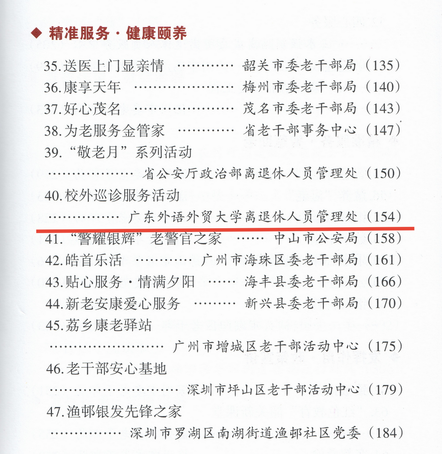 本网讯 近日,我校收到中共广东省委老干部局编印的《广东老干部工作品牌创建100例》,我校“校外巡诊服务活动”成功入选首批全省老干部工作品牌库。这是我校突出自身特色,创新服务模式,积极打造新时代老干部工作品牌的重要成果。