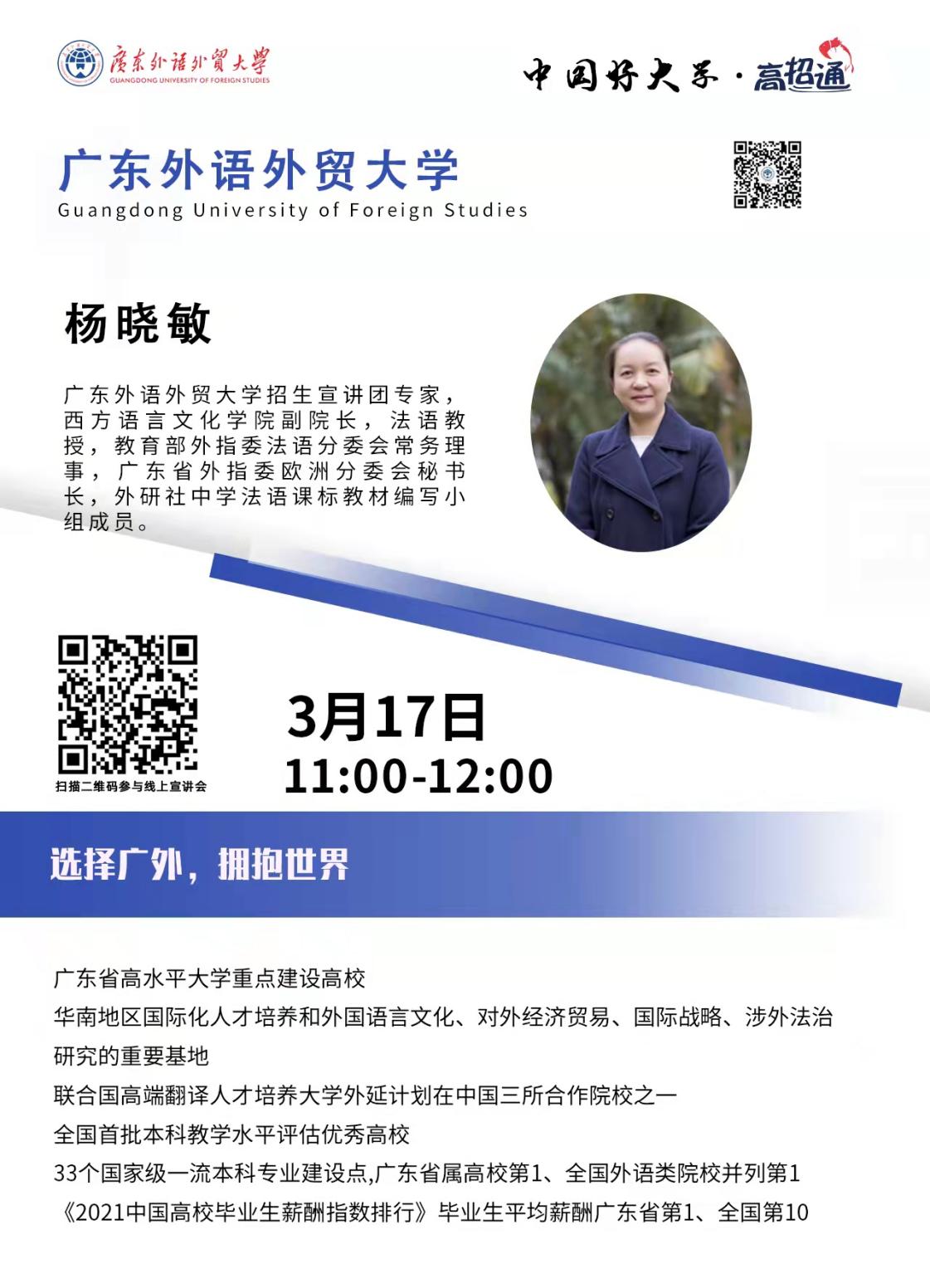 宣讲会由来自我校招生宣讲团的杨晓敏教授主讲。宣讲会上,杨晓敏就广外概况、师资力量,学科实力、人才培养、国际交流、奖助体系、“三高”就业等方面做了精彩的介绍。招生办全体成员则在线上与考生和家长们实时互动,答疑有关招生咨询。直播间的内容分享获得了考生和家长们的高度评价。