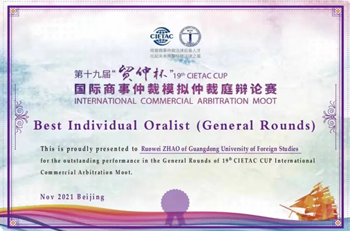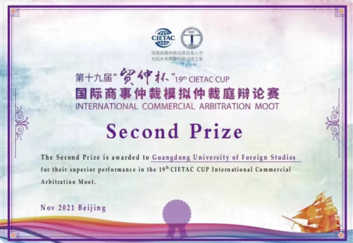 荣获第十九届“贸仲杯”国际商事仲裁模拟仲裁庭辩论赛全国二等奖