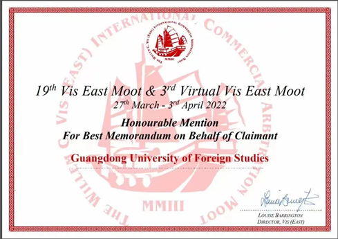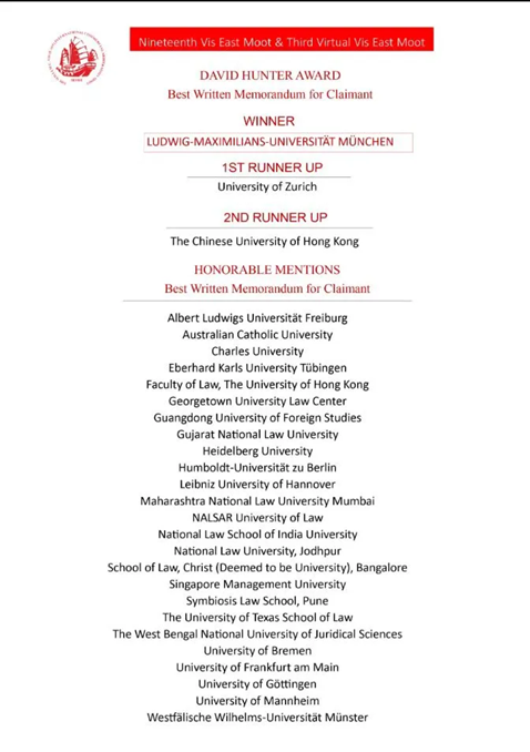 本网讯 近日,第十九届Vis East国际商事仲裁模拟仲裁庭比赛(Willem C. Vis East International Commercial Arbitration Moot)于线上举行。经过四天循环赛的激烈角逐,我校代表队从来自世界各国的140支队伍中脱颖而出,获得申请方最佳书状荣誉提名(位列全球第十)。在本次比赛中,我校代表队是中国大陆高校在该持方唯一获得最佳书状荣誉提名奖的队伍。