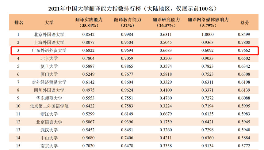 大学翻译能力指数是一所大学在翻译实践、教学、研究和翻译网络媒体影响力等方面综合实力的反映。翻译学一直是我校的传统优势领域,综合实力位居全国前列。自开展高水平大学建设以来,我校外语学科在外国语言学及应用语言学、外国文学、翻译学、比较文学与跨文化研究、国别与区域研究等五大领域协同发力,取得了显著的建设成效。接下来,学校将继续强化学科顶层设计,举全校之力支持外语学科“冲一流”,加快推动翻译专业学位博士点建设,进一步擦亮“广外翻译”金字招牌。
