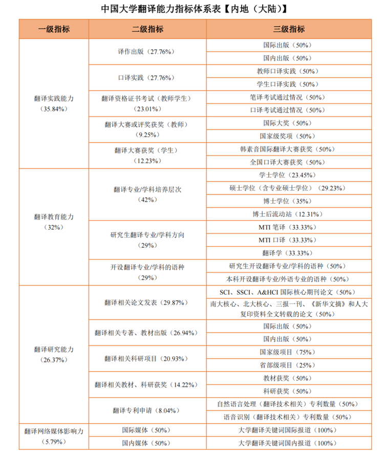 据悉,“全球国家翻译能力指数”和“中国大学翻译能力指数”由北京外国语大学国家翻译能力研究中心研究团队研发。中国大学(大陆地区)翻译能力指标体系包括:翻译实践能力、翻译教育能力、翻译研究能力和翻译网络媒体影响力4个一级指标,下设15个二级指标、31个三级指标。研究团队调研了中国454所大学(包括大陆434所大学和港澳台地区20所大学)的翻译能力,最终得出上述指数排名。
