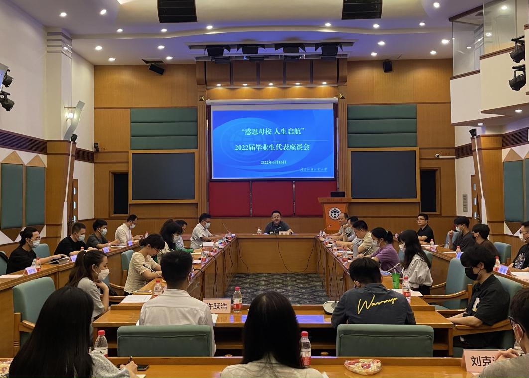 本网讯 近日,以“感恩母校 人生启航”为主题的2022届毕业生代表座谈会在北校区行政楼国际会议厅召开。校党委副书记唐锐,学生工作部(处)、研究生工作部、校团委、学生就业指导中心、教务处、校友事务与合作发展处相关负责人,2022届毕业生代表等参加座谈。