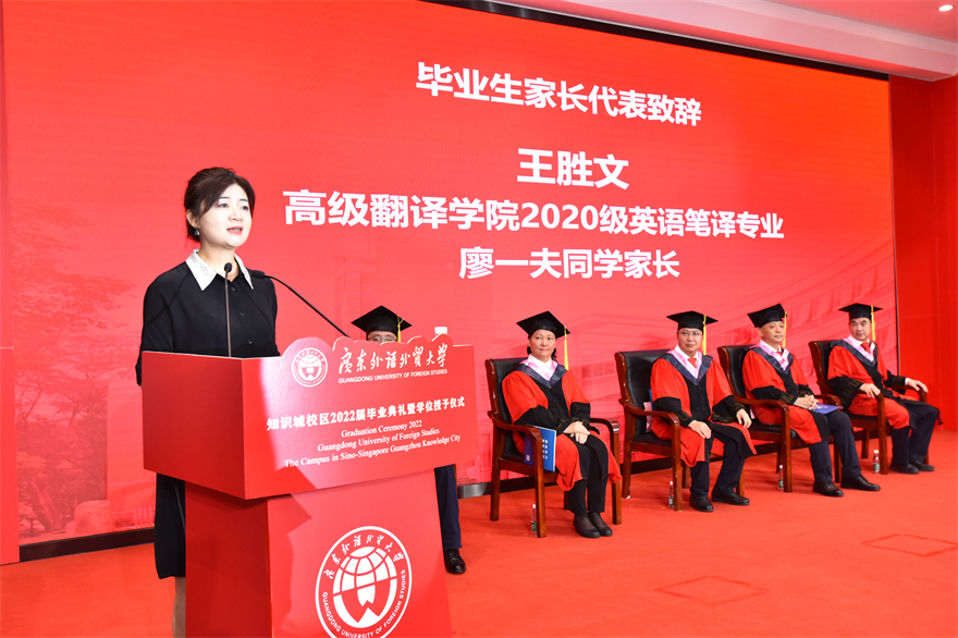 毕业生家长代表王胜文在致辞中提到,广外浓厚的学术氛围及勤奋、严谨、认真的良好学风,使同学们增长了知识,开阔了视野,更学会了责任和担当,希望同学们继续努力,成长为高素质的国际化人才。