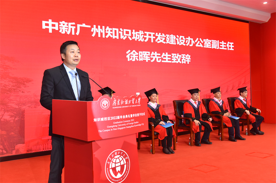中新广州知识城开发建设办公室副主任徐晖在致辞中向毕业生致以诚挚的祝贺和美好的祝愿。他提到,今天不是庆祝“结束”,而是欢呼开始;不是纪念“完成”,而是宣布进步。希望同学们的生命之舟在新的岁月港湾里启航,承载着对未来的憧憬和畅想,直挂云帆,乘风破浪。