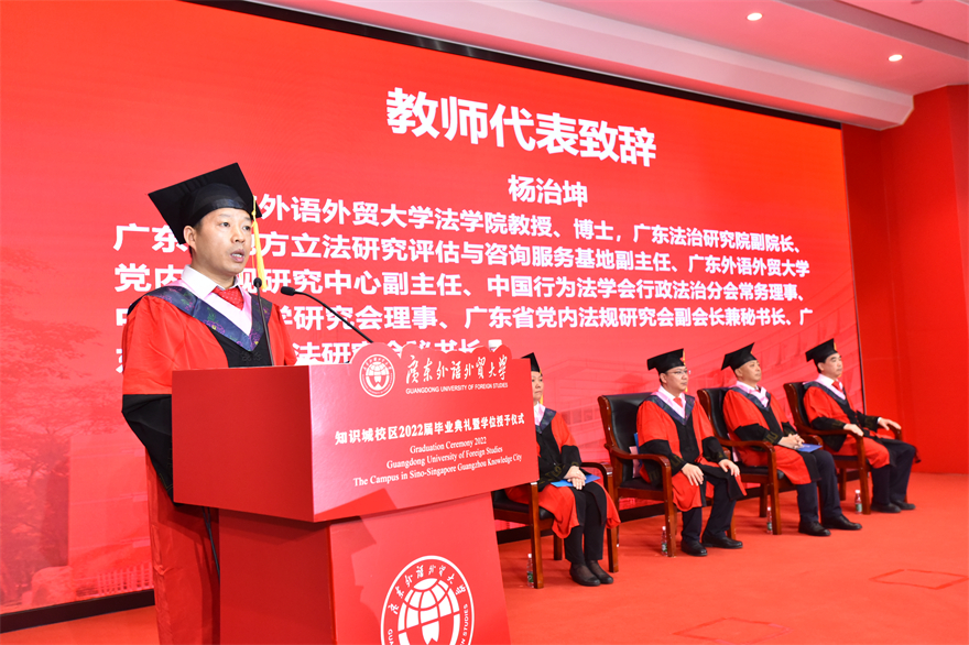毕业生代表、高级翻译学院邱槿表达了自己对母校、师长、朋友、父母的感谢。他表示,在过去两年求学日子里,自己在进德楼的教室里、在知识城的社会大课堂上、在各大比赛中享受翻译的快乐,不仅见证着知识城校区日新月异的变化,知识城校区也见证着他的成长。