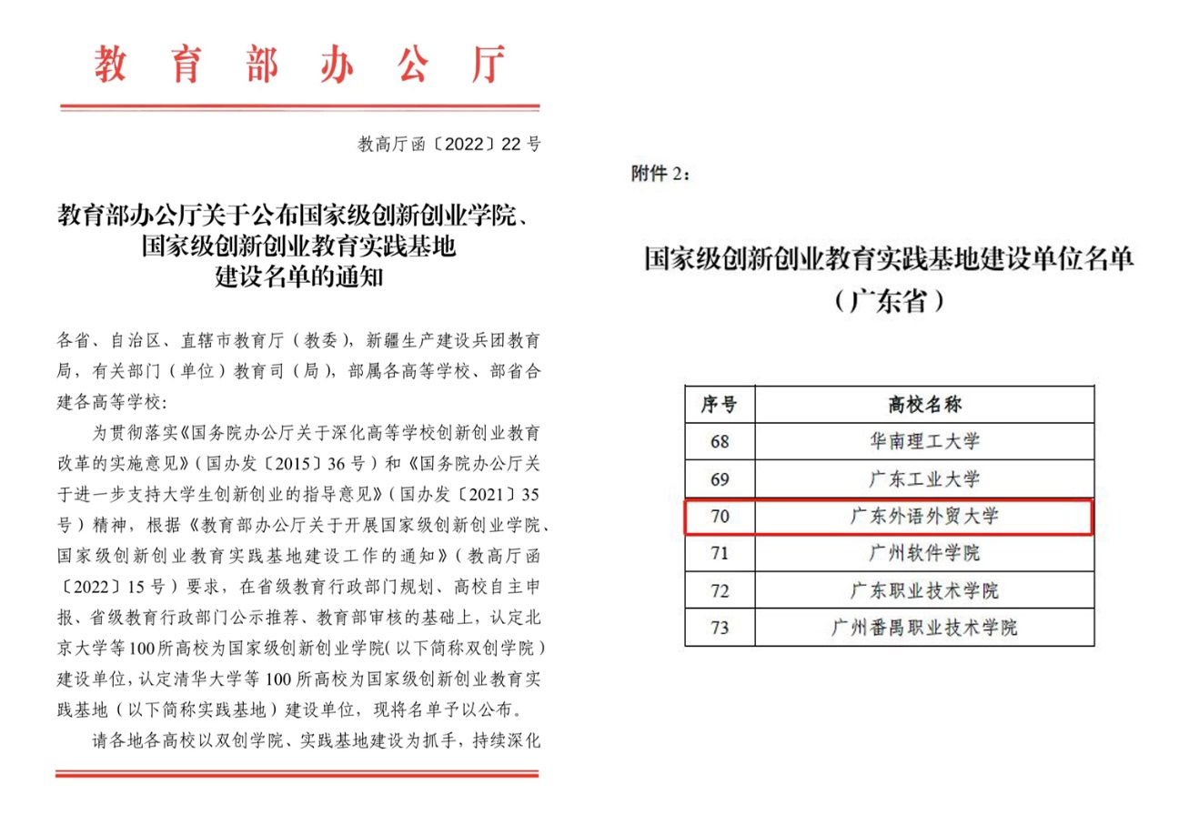 本网讯 近日,教育部办公厅发布《关于公布国家级创新创业学院、国家级创新创业教育实践基地建设名单的通知》(教高厅函〔2022〕22号),认定清华大学等100所院校为国家级创新创业教育实践基地建设单位,我校申报的创新创业中心成功入选,建设周期5年,获教育部首期建设经费50万元资助,是全国外语本科高校中唯一入选的学校,广东省共3所本科高校入选。