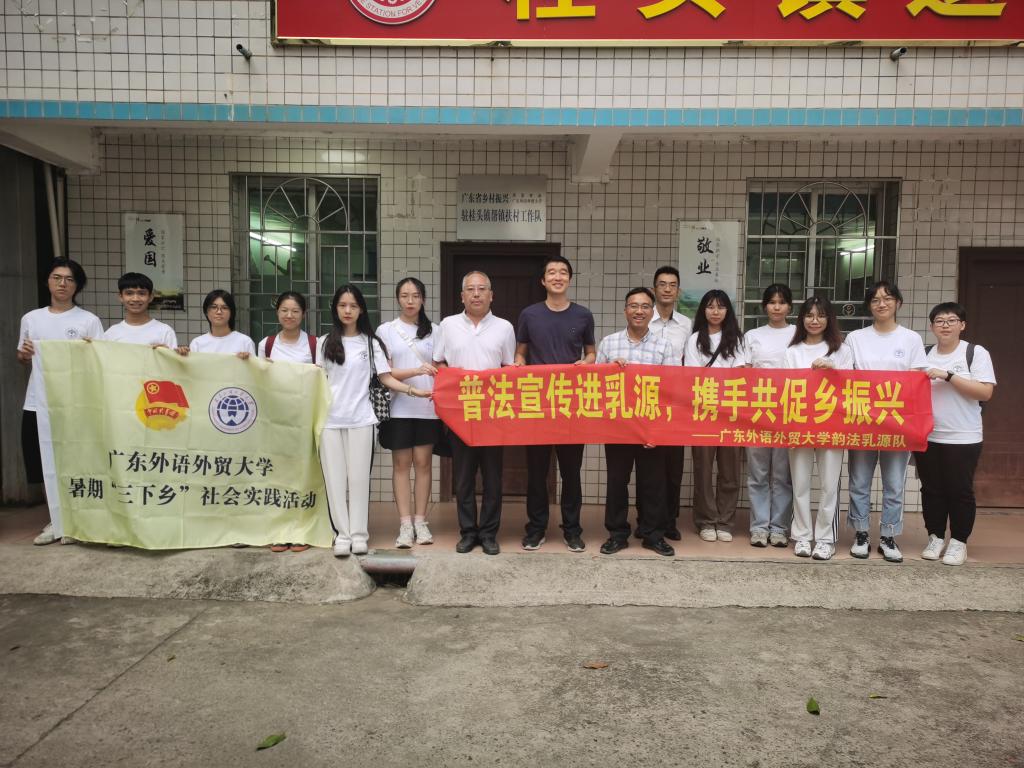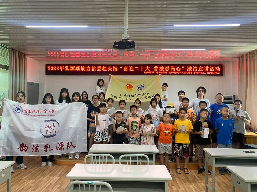 今年暑假,为深入学习贯彻习近平法治思想,进一步推动实现乡村振兴法治化,广外法律援助中心(以下简称“广外法援”)开展了“乡村振兴、法治同行”暑期社会实践活动,组织五支普法队伍走进乡村、走进基层,开展理论宣讲、普法宣传、送法下乡、法律援助、纠纷调解等活动,其中,获评今年全国“三下乡”社会实践优秀团队——韵法乳源队走进我校和省外办共同帮扶的韶关乳源桂头镇开展普法宣传活动。