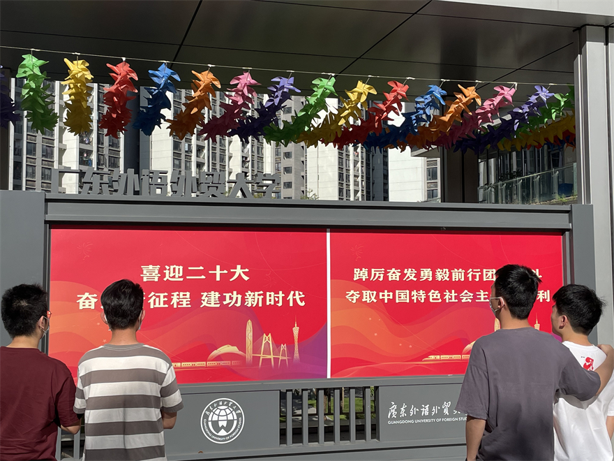 据悉,除开设四个直播现场外,我校还开通网络直播和录制点播功能,方便师生在课室或宿舍进行观看。为营造迎接二十大的良好校园氛围,学校在白云山校区、大学城校区、知识城校区校道上挂起横幅标语,在宣传栏张贴宣传画,体现广外师生期盼党的二十大胜利召开的热切心情。