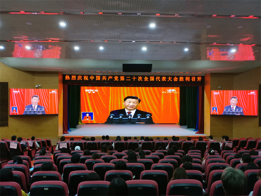 在场收看直播的师生聚精会神,认真学习领会大会精神。开幕会直播结束后,师生们欢欣鼓舞,倍感振奋,反响热烈。大家一致表示,党的二十大是在全党全国各族人民迈上全面建设社会主义现代化国家新征程、向第二个百年奋斗目标进军的关键时刻召开的一次十分重要的大会。习近平总书记作的报告,全面总结了过去五年的工作和新时代十年的伟大变革,科学谋划未来五年乃至更长时期党和国家事业发展的目标任务和大政方针,提出一系列新思路、新战略、新举措,是指导我们全面建设社会主义现代化国家、向第二个百年奋斗目标进军的纲领性文献。党员干部表示,将不忘立德树人初心,牢记为党育人、为国育才使命,认真履职尽责,以实际行动学习好、宣传好、贯彻好党的二十大精神。青年学生表示,将坚定不移听党话、跟党走,让青春在全面建设社会主义现代化国家的火热实践中绽放绚丽之花。