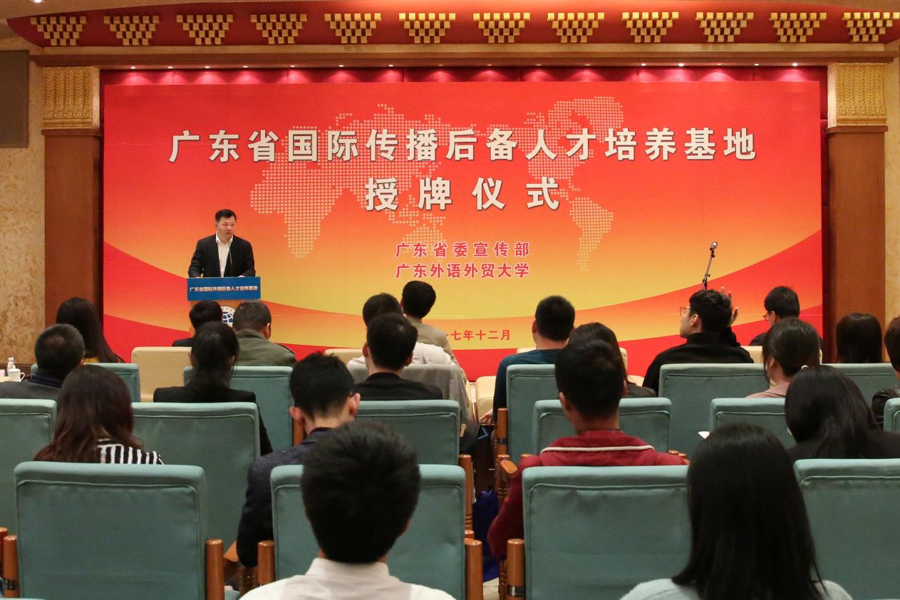 为贯彻落实中央关于“加强国际传播能力和对外话语体系建设,推动中华文化走向世界”、“大力加强国际传播人才培养”的要求以及中央、省委关于精心构建对外话语体系、推动对外宣传事业发展的有关要求,进一步创新青年优秀人才发现培养推介机制,促进优秀国际传播人才的成长。2017年12月,广东省委宣传部在我校建立广东省国际传播青年人才培养基地,时任省委常委、宣传部部长慎海雄为基地授牌。