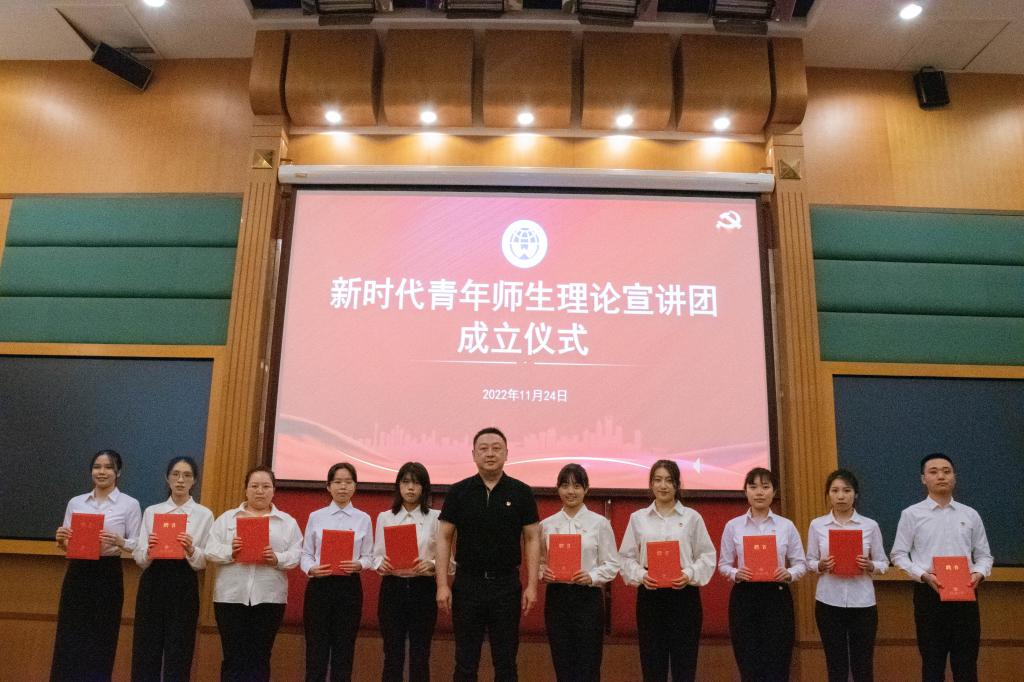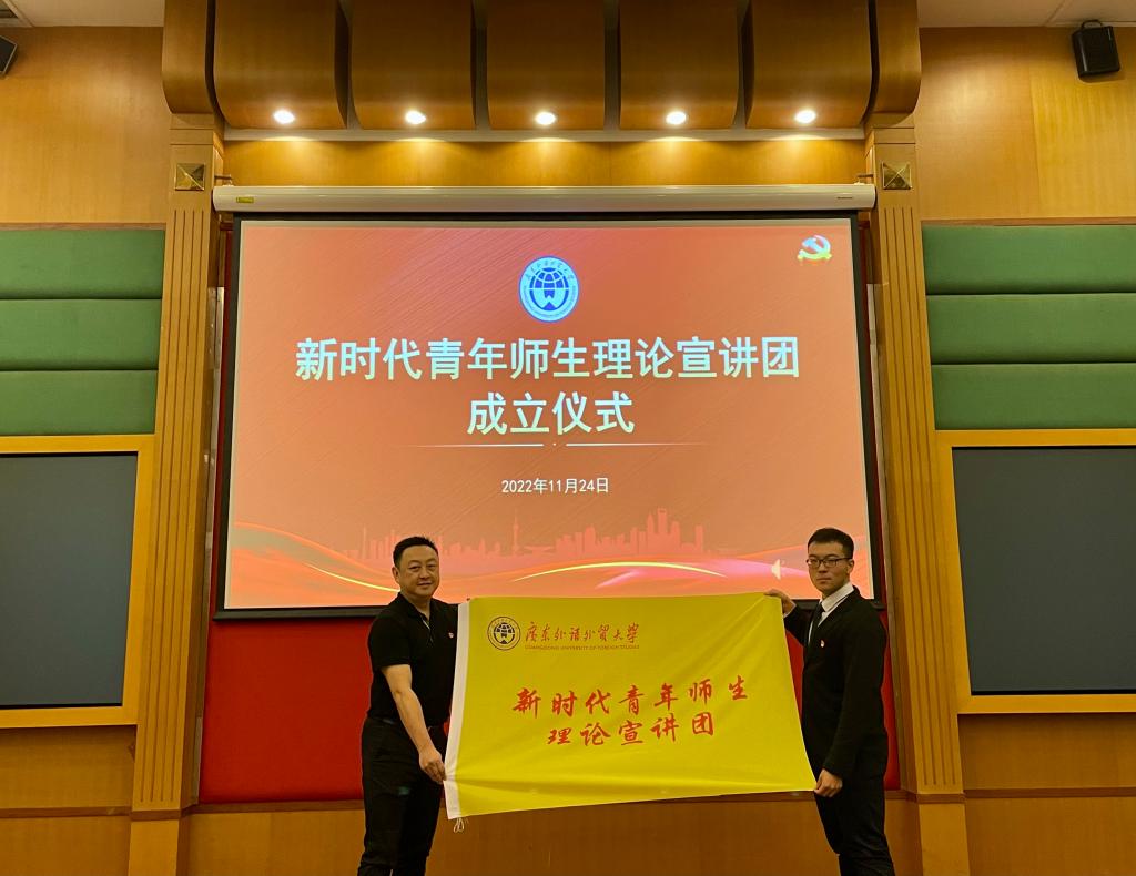 本网讯 为深入落实学校党委对学习宣传贯彻党的二十大精神的全面部署,扎实做好党的二十大精神专题宣讲工作,我校成立新时代青年师生理论宣讲团。11月24日下午,学生工作部在白云山校区、大学城校区和知识城校区分别设立会场,通过线上线下连线的形式举行宣讲团成立仪式。校党委副书记唐锐在仪式上致辞,并为宣讲团成员颁发聘书、授旗。宣传部、学生工作部、校团委负责人,各学院学生工作负责人、宣讲团成员、青马班学员代表及相关人员参加仪式。成立仪式由学生工作部部长国佳主持。