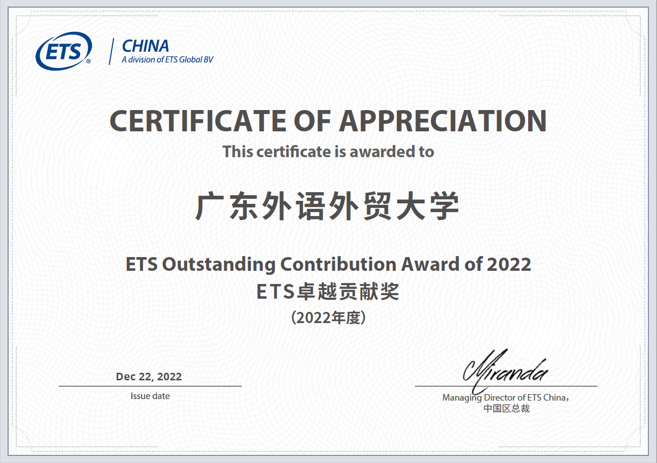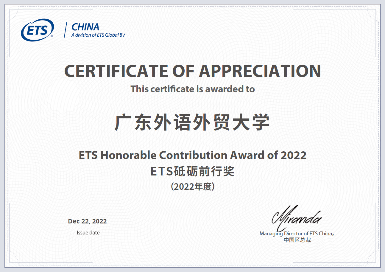 本网讯 12月22日,在美国教育考试服务中心(ETS)举办的2022年度全国托福、GRE研讨会上,我校荣获“2022年度ETS卓越贡献奖”、“2022年度ETS砥砺前行奖”两项荣誉称号。这是我校过去四年连续第三次在美国教育考试服务中心每两年度举办一次的评奖活动中再获殊荣。