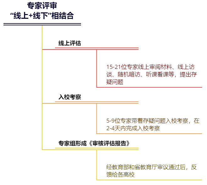 袁:本轮审核评估时间为2022-2025年,2022年启动评估试点,2023-2025年分批组织实施评估。评估程序包括评估申请、学校自评、专家评审、反馈结论、限期整改和督导复查。其中,专家评审包括线上评估和入校评估两个阶段。