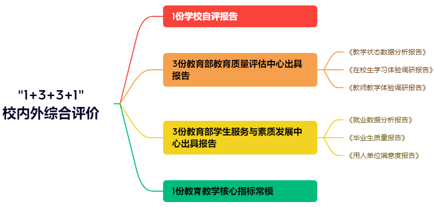 三是评估视角更加全面。推出“1+3+3+1”校内外综合评价,包括1份《自评报告》、3份教育部教育质量评估中心报告(《教学状态数据分析报告》《在校生学习体验调研报告》《教师教学体验调研报告》)和3份教育部学生服务与素质发展中心报告(《就业数据分析报告》《毕业生质量报告》《用人单位满意度调查报告》)作为支撑,提供1份关键性办学指标常模供作为参考,通过常模比较,发现优势和短板。