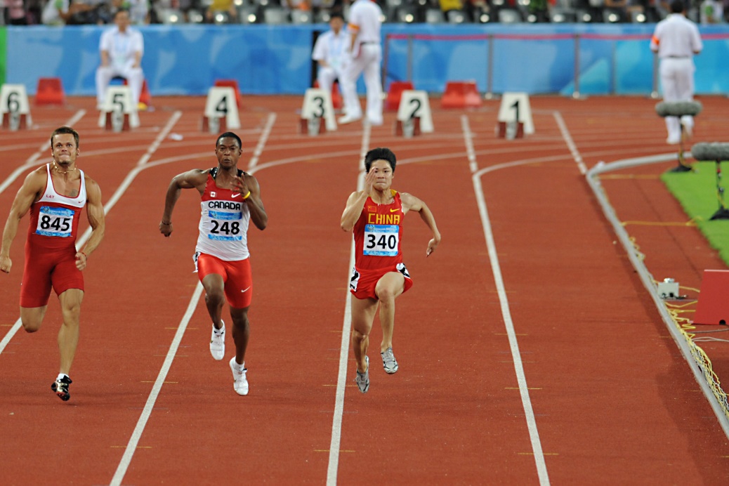 新闻社记者拍摄初登国际赛场的苏炳添在大运会百米赛场