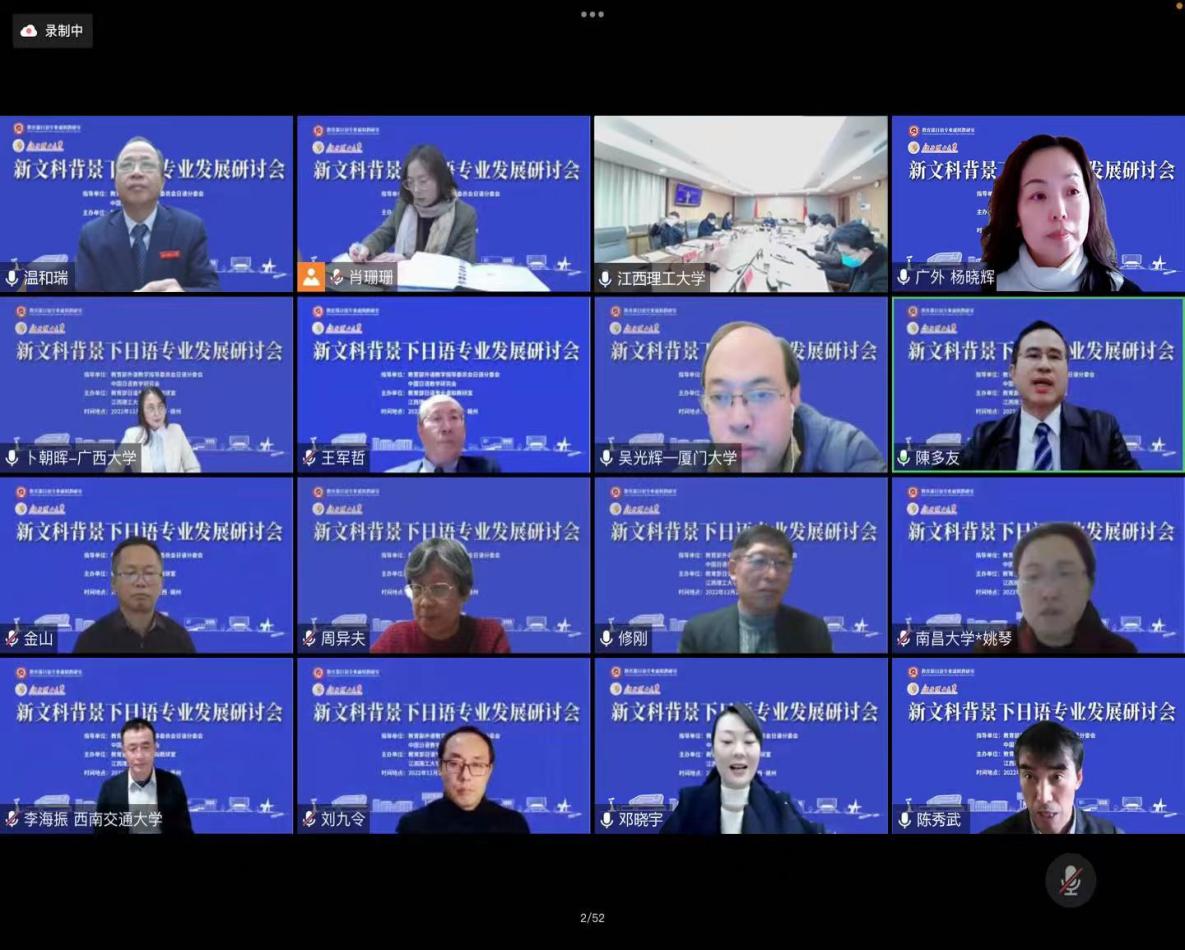 本网讯 12月24日,由教育部高等学校外国语言文学类专业教学指导委员会日语分委员会、中国日语教学研究会指导,教育部日语专业虚拟教研室、江西理工大学主办,江西理工大学外国语学院、中国日语教学研究会华南分会承办的“新文科背景下日语专业发展研讨会”在赣州举行。该会议以“聚焦学科发展新思路,谱写科研对话新篇章”为主题,采取主旨报告、基调演讲、分科论坛等方式,以线上线下相结合的形式举办,线下会场设在江西理工大学三江校区。业界专家、学者及学生参加了本次会议,线上直播观看人数达1273人次。