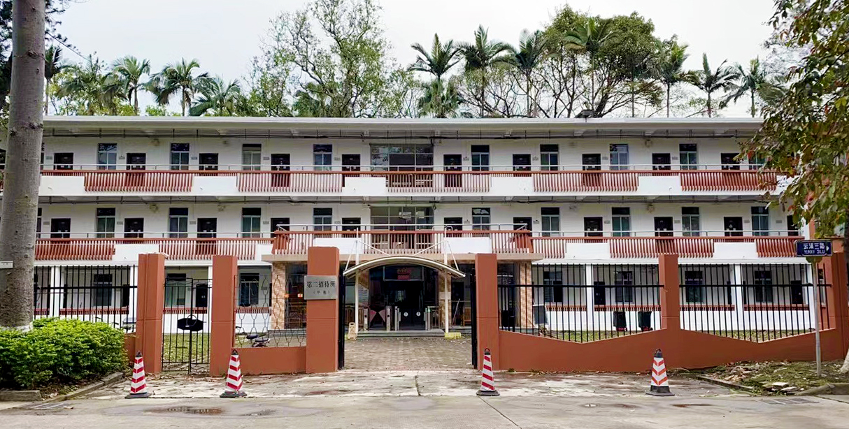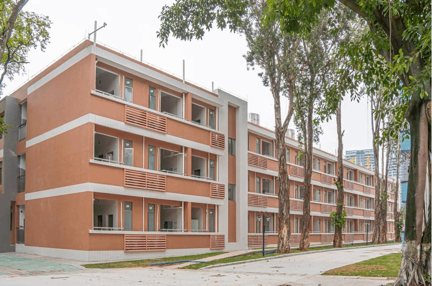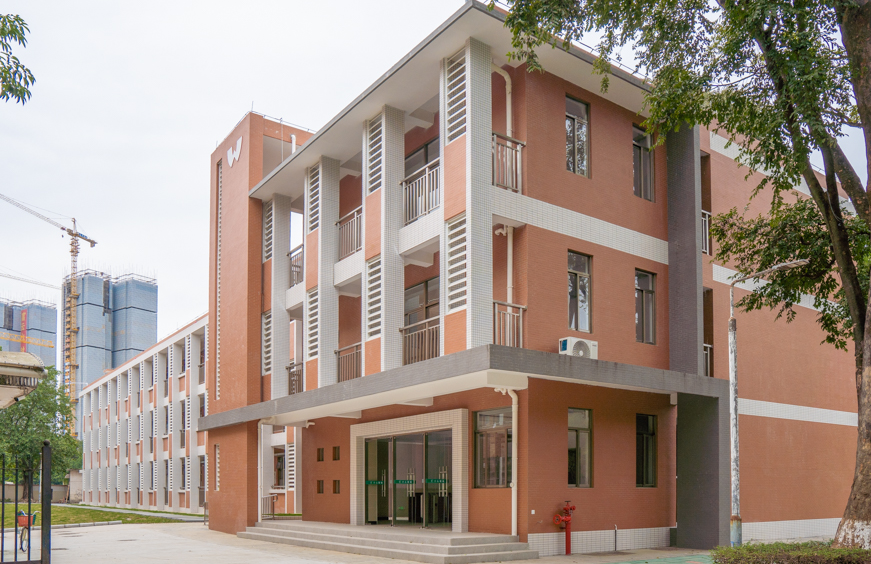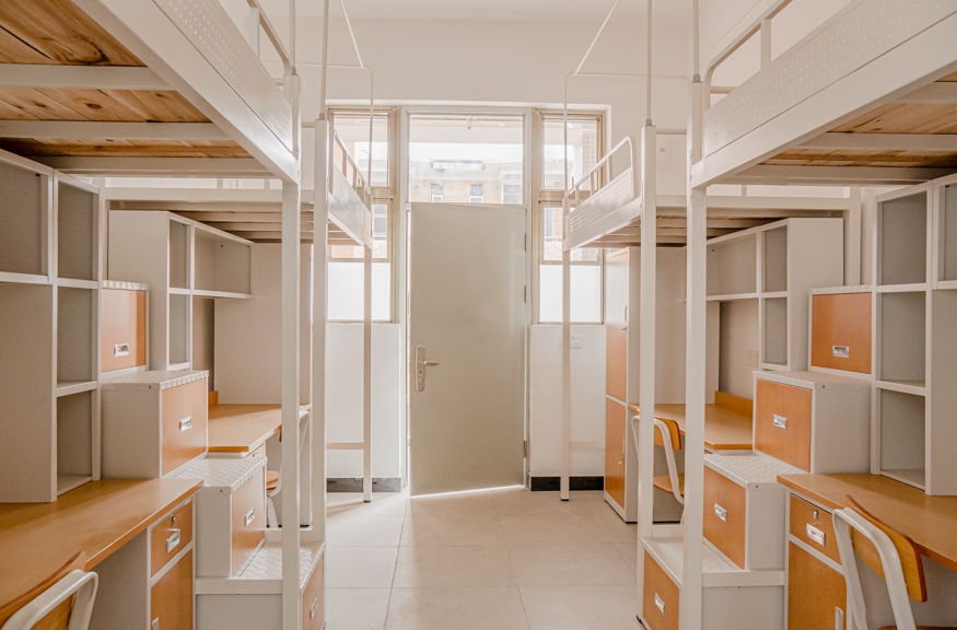 全新宿舍楼继续沿用了学校的红白主色调,为方便学生出行,在周边的草坪新建了石板路,在进楼的阶梯处设置了无障碍通道;为使得宿舍空间更加舒适,宿舍内楼层高度高达3.6米;宿舍为标准的四人间,设有简洁美观的独立卫浴和洗手台;新设挂钩和纸巾盒等贴心装置利于学生拎包入住,采用光滑墙壁和透明玻璃设计,让宿舍保持光线充足明亮。楼道里的消防栓采用隐藏式设计,楼道地板采用防滑材质,设计楼层屋檐外伸防止雨水飘进,采用加高的栏杆保障学生的安全;第二第三层还设有文化室和活动室丰富学生的宿舍生活。