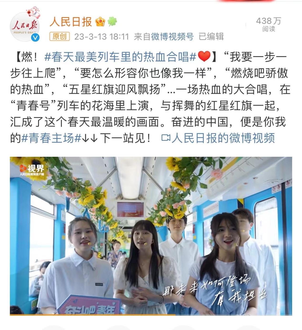 当《歌唱祖国》的响亮歌声充斥着整辆列车时,青春的意义已有答案。2023年全国两会胜利闭幕,祖国新的征程再次吹响号角,正如习近平总书记在两会中指出,“强国建设、民族复兴的接力棒历史地落在我们这一代人身上。”