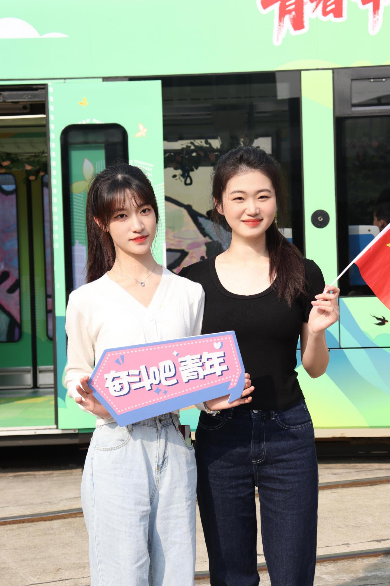 在“青春号”有轨列车上,乘客们被热情活泼的广外学子带动着一起欢唱歌曲,列车上洋溢着青春向上的气氛,其中我校艺术学院李泓锆、黎瑞茵和刘其欢三位同学担任音乐快闪录制的主唱人员。我校学子在视频中以饱满的热情投入到演唱中,他们挥舞着手中的红旗,放声歌唱。